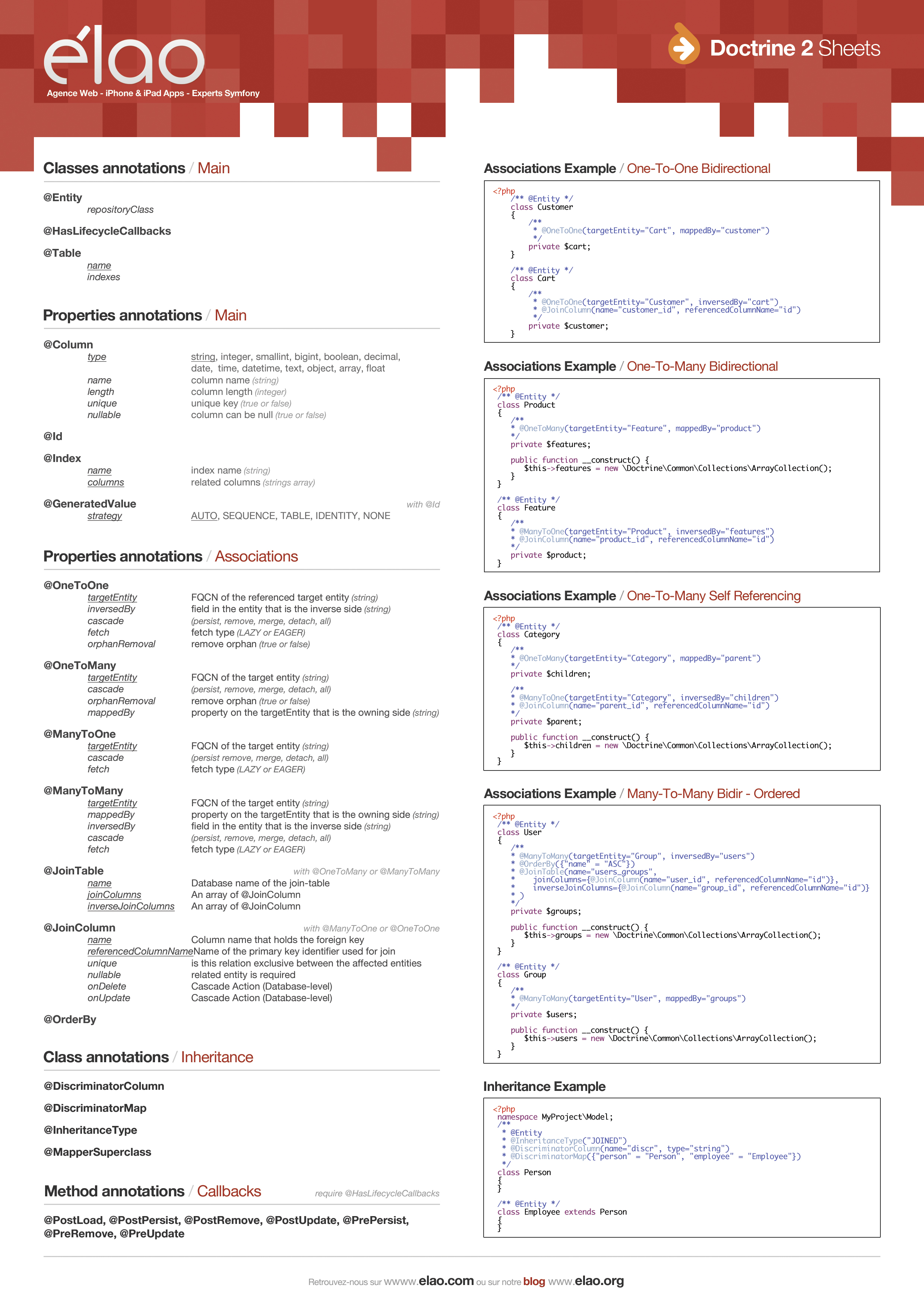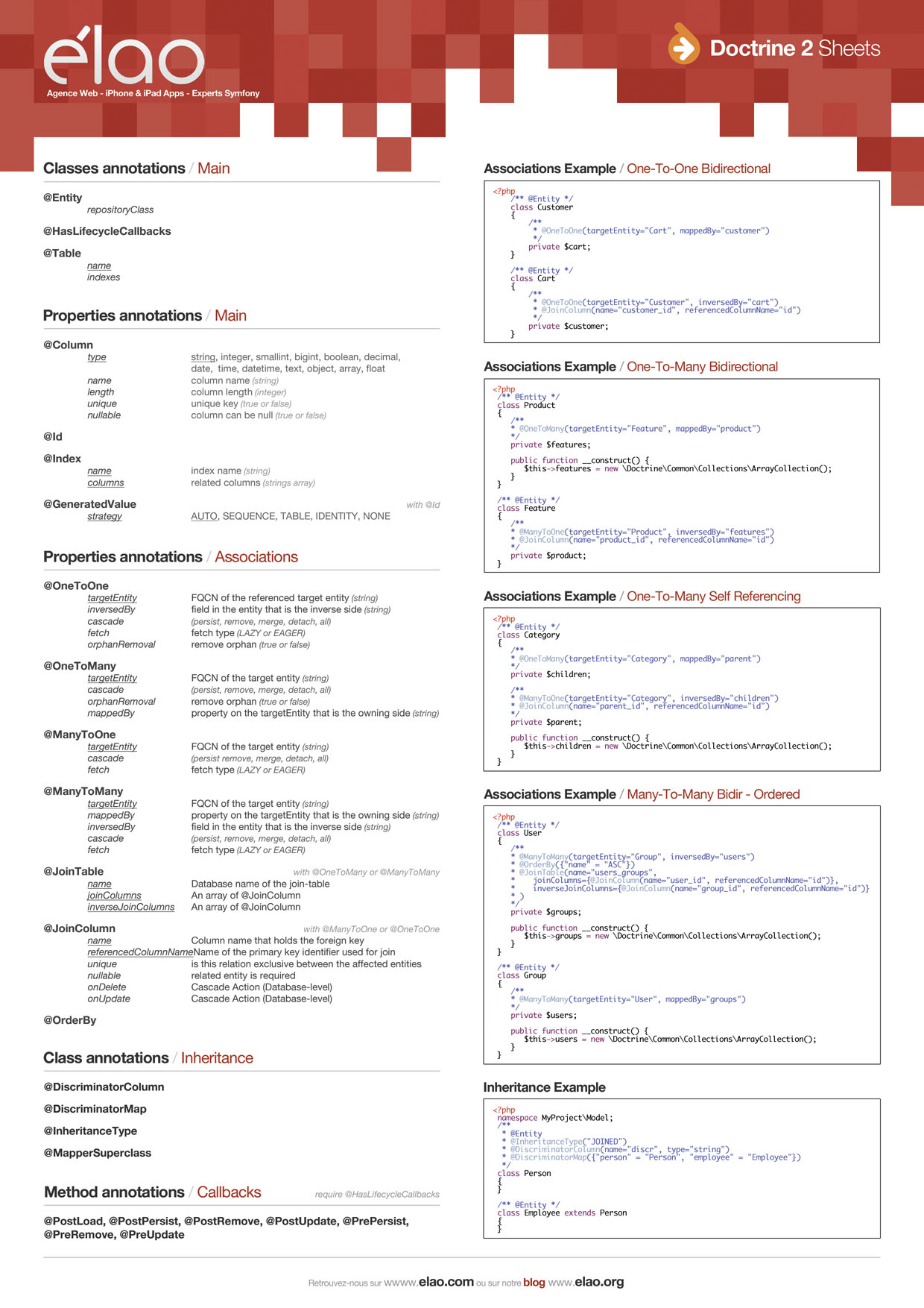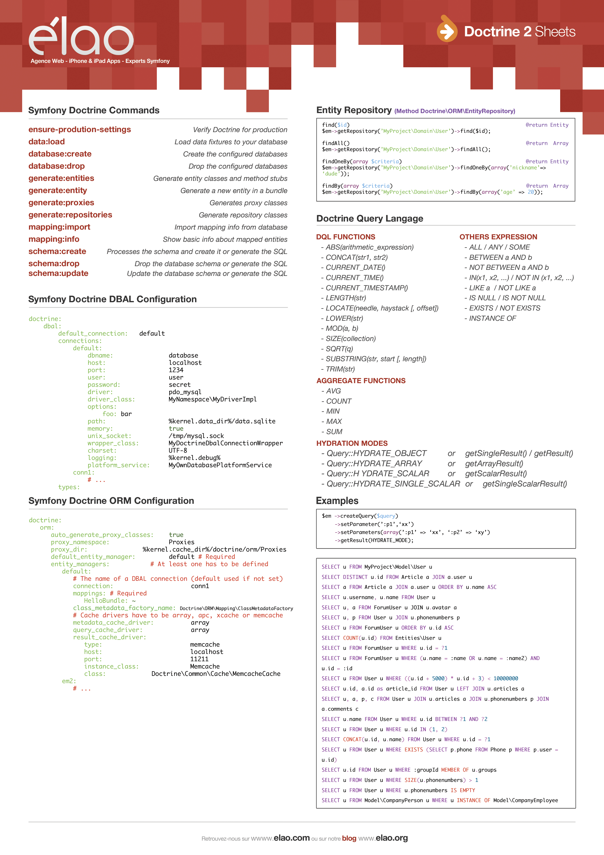 Here are two Doctrine2 cheatsheets for use by Symfony2 developpers. As nobody is perfect, keep them in sight and enjoy your development time with Symfony2 & Doctrine2 !